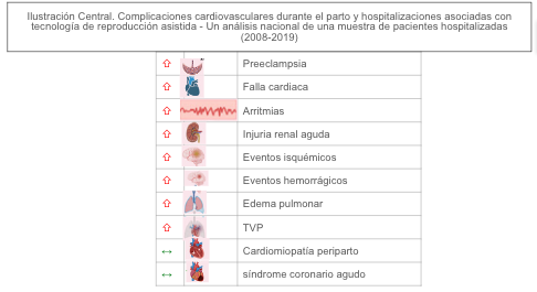 Fuente: Adaptado, traducido  y modificado de Zahid S, Hashem A, Minhas AS, Harrington CM, Quesada O, Aggarwal NR, Shufelt CL, Baker VL, Michos ED. Cardiovascular Complications During Delivery Admissions Associated With Assisted Reproductive Technology (from a National Inpatient Sample Analysis 2008 to 2019). Am J Cardiol. 2023;186:126-134