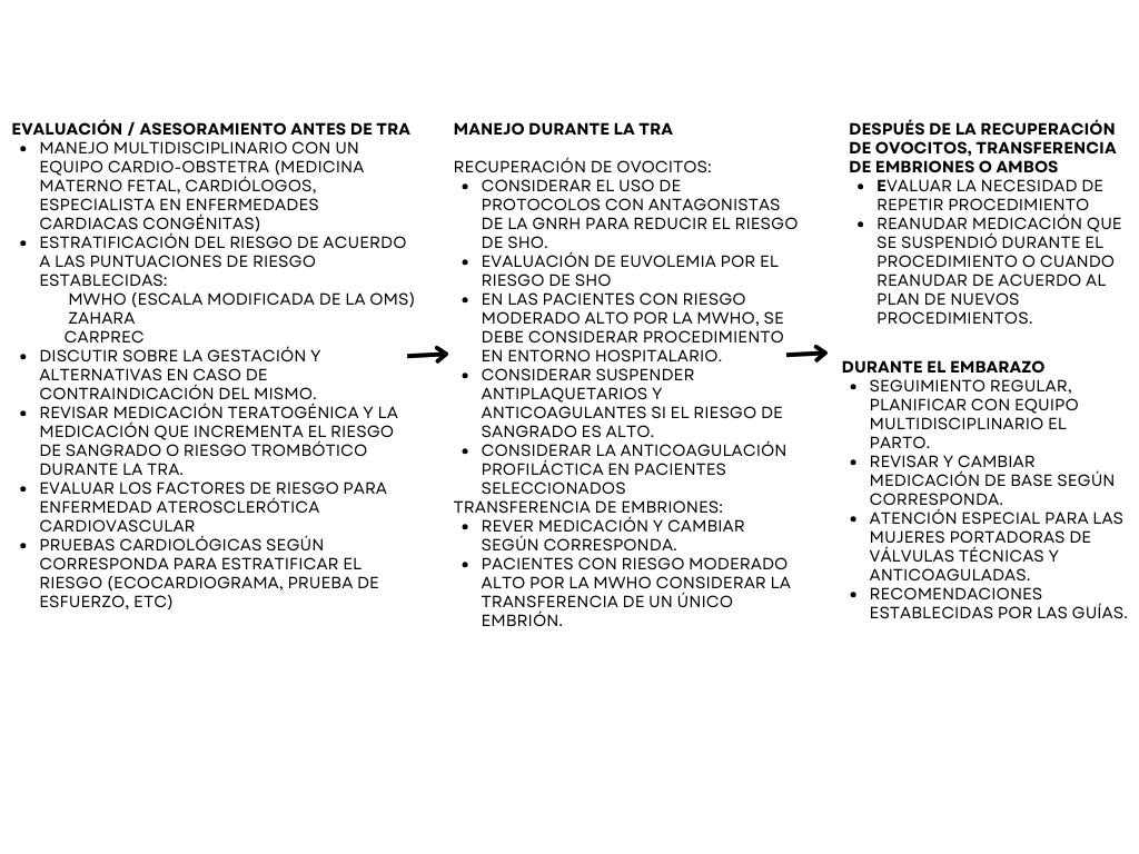 Se ha descrito una asociación entre las TRA y el desarrollo de complicaciones cardiovasculares durante la gestación y posterior a la misma; no obstante, estos estudios están realizados en poblaciones heterogéneas, lo que dificulta la extrapolación de resultados a otros grupos. Sin embargo, la identificación de factores de riesgo y estrategias de prevención previas a la exposición a TRA sigue siendo un tema poco abordado y con escasas recomendaciones hasta la fecha, surgiendo con ello la necesidad de generar estrategias de identificación y prevención antes del inicio de cualquier técnica de reproducción asistida con el objetivo de impactar en el beneficio cardiovascular desde una perspectiva multidisciplinaria. (2)