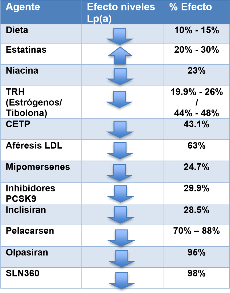 Resumiendo, ni la niacina, ni los CETP inhibidores ni la TRH, son alternativas terapéuticas para sujetos con Lp(a) elevada. Por otra parte,  las estatinas y el ezetimibe, terapéuticas con probado beneficio clínico, han mostrado que aumentan o no modifican los niveles de Lp(a).
