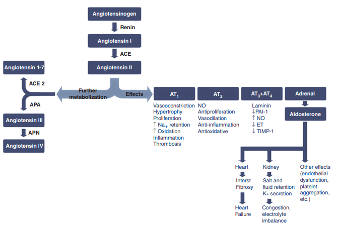 La angiotensina II es un agente vasoactivo que provoca vasoconstricción, elevación de la presión arterial, hipertrofia y muerte de miocitos, fibrosis miocárdica y estimula la secreción de aldosterona en la corteza suprarrenal. Sus receptores se encuentran principalmente en las células mesangiales intraglomerulares, donde inducen su contracción y estimulan la liberación de aldosterona. La aldosterona es una hormona secretada por la zona glomerulosa de la corteza suprarrenal, cuya función principal es aumentar la reabsorción de sodio y agua en los riñones, incrementando el volumen sanguíneo.