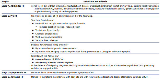 Como ya se ha mencionado la ACC/AHA clasifica a la insuficiencia cardiaca estadios o grupos según signo sintomatología. En el estadio A (“at risk”) se encuentra a los pacientes asintomáticos con alto riesgo de desarrollar insuficiencia cardiaca, sin anomalia estructurla o funcional identificada. Estadio B (“pre-IC) aquellos asintomáticos con cardiopatía estructural claramente relacionada con insuficiencia cardiaca.  Por ultimo los estadios donde, además de presentar cardiopatía estructural, la patología se manifiesta sintomática. Estadio C (estadio sintomático de IC); y en los casos avanzados, el estadio D (estadio avanzado de IC), donde la sintomatología se vuelve incapacitante para la vida cotidiana a pesar del tratamiento y requieren hospitalización con mayor frecuencia. (ver figura 1)